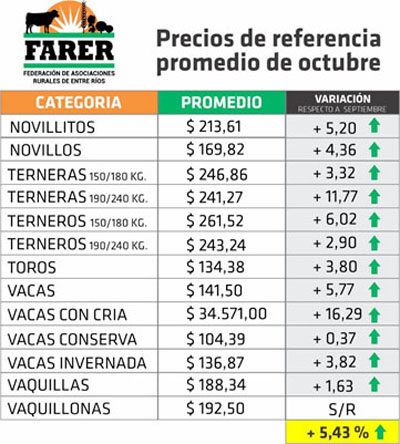 En síntesis, los precios promedios que arrojaron los remates en la provincia de Entre Ríos en octubre fueron los siguientes: