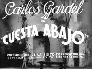 A fines de 1933 Gardel viajó por primera vez a Estados Unidos, donde cantó con gran éxito por la NBC de la ciudad de Nueva York, acompañado por la orquesta de la radio dirigida por Hugo Mariani y teniendo como arreglador al músico argentino Terig Tucci, radicado hacía años en Estados Unidos. Gardel convocó a Alfredo Le Pera para que participe como su representante ante la Paramount, con el fin de realizar alguna película en los Estados Unidos, en un momento en el que ese país padecía la gran depresión de la década de 1930. El contrato se firmó el 20 de Marzo de 1934, acordando crear una empresa productora con el nombre de �S�0xito Corporation⬝ subsidiaria de Paramount, cuyo único accionista era Gardel y que inicialmente realizarían dos películas en ese año: �SCuesta Abajo⬝ y �SEl Tango en Broadway⬝; y de esa manera inicia su participación en el cine estadounidense con �SCuesta Abajo⬝ película cuya filmación se realizó en dos semanas, durante el mes de Mayo de 1934.-