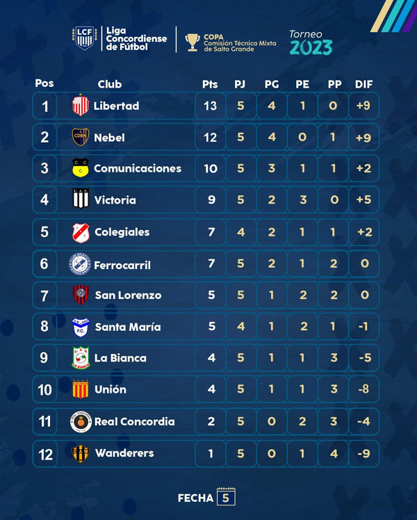 El domingo se jugaron cinco encuentros correspondientes a la quinta fecha de la Primera «A» Copa Comisión Técnica Mixta de Salto Grande. Paradójicamente todos los partidos terminaron igualados. Libertad y San Lorenzo no se sacaron ventajas. Comunicaciones y La Bianca terminaron 1 a 1. En un juego cambiante, Santa María y Ferro culminaron 2 a 2, Victoria y Wanderer�"s tampoco abrieron el marcador y fue 0 a 0 y finalmente Unión lo igualó sobre el cierre para el 1 a 1 con Real Concordia. Este lunes, a las 15.30 se cerró la jornada con Defensores de Nebel ante Colegiales en el Parque Mitre.